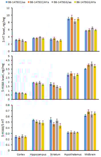 3.6. Effects of C1473G and AY Mutations on 5-HT, 5-HIAA Levels and the 5-HIAA/5-HT Turnover Rate in the Brain