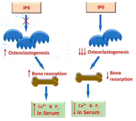 One proposed effect of IP6 on bone metabolism. IP6 can modulate the proliferation of osteoclasts (osteoclastogenesis), thereby controlling the rate of bone resorption. In the absence of IP6, the rate of osteoclastogenesis increases (as indicated by the upward arrows), resulting in increased bone resorption and increased serum calcium and inorganic phosphate. In the presence of sufficient IP6, decreased osteoclastogenesis and bone resorption (as indicated by the downward arrows) are observed as indicated by the downward arrows. This may be significant in persons who have pre-existing bone pathologies.