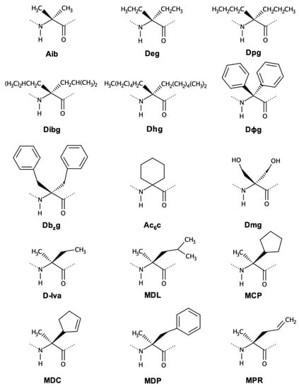The most widely studied class of ncAA is probably the class of α,α-dialkyl glycines (Figure 4). This type of residue is found in many naturally occurring peptides, especially in antimicrobial peptides [56,57,58]. The Aib (α-aminoisobutyric acid) is the prototype of this class and is known to restrict the dihedral angles to generate α-helical conformations [49,59,60]. Figure 4 shows reported symmetric and asymmetric disubstituted glycines.