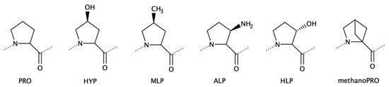 Two-dimensional structures of the encoded amino acid Pro and proline analogues. From left to right: l-Pro, cis-4-hydroxy-l-proline (Hyp), cis-4-methyl-l-proline (MLP), cis-3-amino-l-proline (ALP), trans-3-hydroxy-l-proline (HLP), and 2,4-methano-l-proline (methanoPRO).