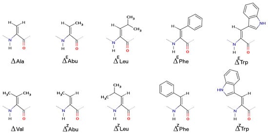The conformational properties of peptides carrying α,β-dehydroamino acids have been extensively reviewed in the past [112,113,114,115,116,117,118] but remain a hot topic today [119,120,121]. The residues dehydroalanine (ΔAla), dehydrobutyrine (ΔAbu), and dehydrophenylalanine (ΔPhe) are the most investigated [122,123,124,125,126,127,128]. ΔPhe has been intensively studied computationally [129,130].
