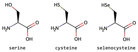 Importantly, although by definition there are 20 l-amino acids encoded by the genetic code, there are two other residues that are proteinogenic: selenocysteine (Sec) and pyrrolysine (Pyl) (Figure 1G,H) [33,34]. Whereas Pyl appears only in proteins of Archaea organisms and a few bacterial genera [35], on the contrary, Sec is found in all kingdoms of life as the building block of selenoproteins. Sec, the 21st amino acid, is a cysteine (Cys) residue analogue with a selenol group in place of the thiol group and has already been found in 25 human selenoproteins and selenoenzymes [36].