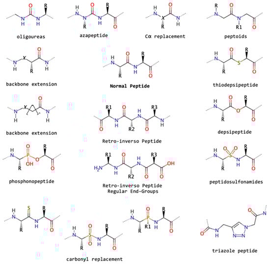 Figure 13 summarizes the most important peptide backbone modifications: for instance, the replacement of Cα, backbone extension, and carbonyl replacement. In detail, we have azapeptides, in which an N atom replaces isoelectronically the Cα, yielding peptides that may be therapeutically applied as inhibitors of cysteine proteases [11,176,177]. Azapeptides presented as β-turn conformations, due to the lone-pair–lone-pair repulsion of the adjacent hydrazide nitrogen atoms [177].
