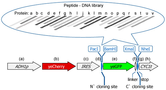 Figure 1. Schematic presentation of yeast GPS-peptidome (yGPS-P). yGPS-P is composed of (a) ADH1 promoter, (b) yeast-enhanced Cherry (yeCherry), (c) Internal Ribosomal Entry Site (IRES), (d) PacI /BamHI N-terminal cloning site, (e) yeast-enhanced GFP (yeGFP), (f) a pentameric linker (GSAGS), (g) XmaI/NheI C-terminal cloning site, (h) CYC1 terminator sequence. A DNA library can be inserted at either the N- or C- termini of yeGFP. Each letter represents different yeast proteins, divided into tiled peptides.
