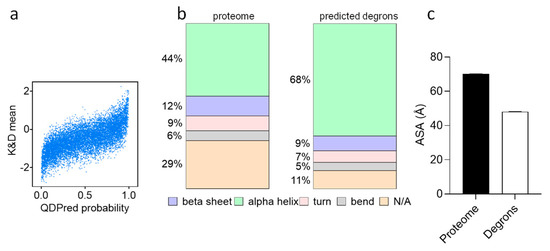 Figure 4. Properties of the yeast degronome. (a) A plot of Kyte–Doolittle hydrophobicity score of all peptides in the screen versus QCDPred probability. (b) Classification and relative proportions of protein secondary structure within the yeast proteome versus that of QCDPred-predicted degrons, based on the AlphaFold Protein Structure Database. (c) Accessible surface area (ASA) of amino acids within degrons compared to the entire proteome. Mann–Whitney U test shows a significance of p < 0.0001.