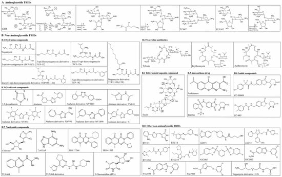 Chemical structures of the main TRIDs: including (A) aminoglycosides and (B) non-aminoglycosides.
