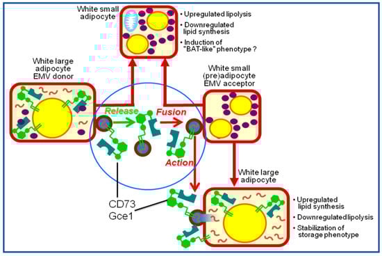 - Müller, G.; Schneider, M.; Biemer-Daub, G.; Wied, S. Upregulation of lipid synthesis in small rat adipocytes by microvesicle-associated CD73 from large adipocytes. Obesity 2011, 19, 1531–1544. [Google Scholar] [CrossRef]