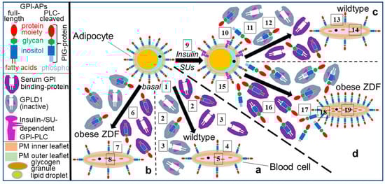 - Müller, G.; Jung, C.; Wied, S.; Biemer-Daub, G. Induced translocation of glycosylphosphatidylinositol-anchored proteins from lipid droplets to adiposomes in rat adipocytes. Br. J. Pharmacol. 2009, 158, 749–770. [Google Scholar] [CrossRef]