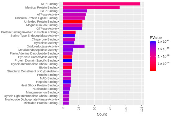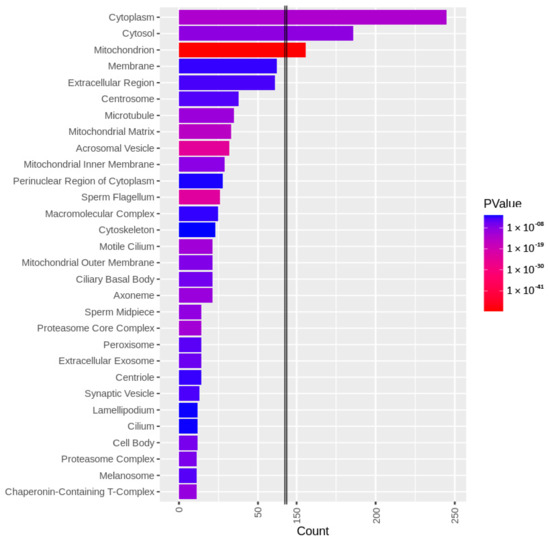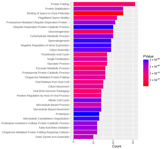 The identified sperm surface protein dataset was assessed via GO enrichment analysis, including biological process, molecular function, and cellular component analyses, as well as the KEGG pathway to classify the identified proteins. The GO biological process enrichment analysis (Figure 1 and Supplementary Data File S2) identified 112 categories, with some of the most enriched ones being protein folding (31 protein hits, p = 2.66 × 10−15), binding of sperm to zona pellucida (25 protein hits, p = 4.4 × 10−22), and flagellated sperm motility (22 protein hits, p = 8.05 × 10−13). The GO cellular component enrichment analysis (Figure 2 and Supplementary Data File S2) identified 86 different categories, with some of the most enriched categories being cytoplasm (245 protein hits, p = 5.1 × 10−14), mitochondrion (156 protein hits, p = 2.16 × 10−52), and membrane (62 protein hits, p = 4.29 × 10−3). Furthermore, the GO molecular function enrichment analysis (Figure 3 and Supplementary Data File S2) identified 96 different categories, with some of the most enriched categories being ATP binding (123 protein hits, p = 5.7 × 10−12), ATPase activity (36 protein hits, p = 1.57 × 10−7), and unfolded protein binding (31 protein hits, p = 1.39 × 10−18). Finally, the KEGG pathway analysis (Figure 4 and Supplementary Data File S2) identified 86 enriched pathways, with some of the most represented categories being metabolic pathways (194 protein hits, p = 1.68 × 10−35); multiple pathways of neurodegeneration (105 protein hits, p = 2.39 × 10−39), including Amyotrophic lateral sclerosis, Huntington’s disease, Parkinson’s disease, Alzheimer’s disease, prion disease, and spinocerebellar ataxia pathways); and proteasome pathway (31 protein hits, p = 1.1 × 10−27).