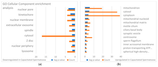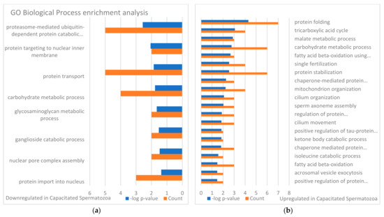 GO biological process enrichment analysis of the identified sperm surface proteins downregulated in the in vitro capacitated spermatozoa (a) and upregulated in the capacitated spermatozoa (b) when compared with non-capacitated sperm control. The full designation of GO terms that are too lengthy are presented in the Supplementary Data File S2.