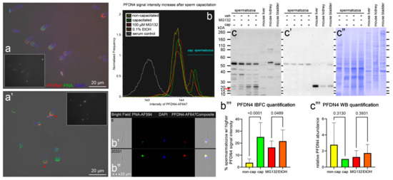 The second studied protein, namely, PFDN4, was localized to the apical ridge region of the sperm head acrosome in NC spermatozoa (Figure 10a), and the signal intensity in the same area was amplified in the IVC spermatozoa (Figure 10a’). The median signal intensity was increased after IVC, resulting in two distinct sperm cohorts (Figure 10b). The higher median signal intensity was attributed to the stronger fluorescence intensity in the apical ridge region (Figure 10b’ vs. Figure 10b”), as was also observed using ICC. The sperm cohort redistribution was significantly hindered (p = 0.05) in the proteasomally inhibited IVC treatment group compared with its vehicle IVC control (Figure 10b,b’’’). We detected multiple bands by using WB. By using mouse liver and kidney tissue controls, we mapped the PDNF4 to the molecular weight of ~17 kDA (Figure 10c,c’,c”). The abundance of the 17 kDa band was reduced in a non-significant manner after IVC (p = 0.31), and proteasomal inhibition had no significant effect on the 17 kDa band density when compared with the vehicle control (p = 0.39, Figure 10c’’’).
