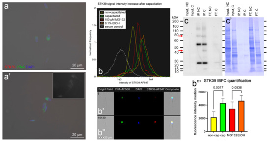 The last studied protein, namely, STK39, was below the detection threshold in NC spermatozoa (Figure 11a), while a faint signal in the acrosomal region was observed in IVC spermatozoa by using ICC (Figure 11a’). The increase in the fluorescence signal intensity in the acrosomal region after IVC was paralleled by a significant increase in the median fluorescence intensity (p = 0.002, Figure 11b,b’’’). The acrosomal labeling of STK39 was detected by using IBFC (Figure 11b’) and confirmed in IVC spermatozoa (Figure 11b’’’). The median fluorescence intensity increase was decelerated in the proteasomally inhibited IVC group (p = 0.09) compared with its vehicle control IVC group (Figure 11b,b’’’). The STK39 protein was below the detection limits of WB in the sperm extracts. Therefore, STK39 was immunoprecipitated from non-capacitated and in vitro capacitated spermatozoa. By using WB, STK39 was detected at ~74 kDa in immunoprecipitates originating from both NC and IVC spermatozoa. Additionally, a 43 kDa band was detected in the immunoprecipitate originating from IVC spermatozoa.