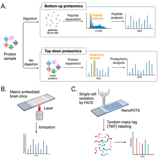 Advancement in mass spectrometry techniques. (A) MS-based proteomics is largely divided into bottom-up and top-down approaches. Bottom-up proteomics analyzes peptides, while top-down proteomics analyzes intact proteins. (B) Imaging mass spectrometry (IMS) provides a spatial distribution of molecules in a tissue sample. (C) Single-cell mass spectrometry (scMS) with NanoPOTs and FACS helps to unbiasedly study proteomes in single brain cells. Created with BioRender.com (Shiz Aoki, Toronto, ON, Canada).