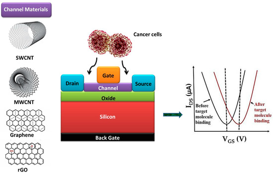 Carbon nanomaterial-based field-effect transistor (CNFET) biosensors have emerged and shown promise in the early detection of cancer [43]. These biosensors mostly utilize CNTs or graphene as the active sensing component, offering unique properties that enhance the sensitivity and performance of the biosensors. The sensing mechanism of CNTs and graphene involves their unique electrical properties, which are sensitive to changes in the surrounding environment. In the case of CNTs, their exceptional electrical conductivity allows them to act as conductive channels in a sensing device. When CNTs are functionalized with specific biomolecules or receptors, such as antibodies or aptamers, they can selectively bind to target analytes, such as cancer biomarkers [44]. The binding event causes a change in the electrical conductivity of the CNTs, either due to charge transfer or changes in the charge distribution near the CNT surface. This change in conductivity can be measured and correlated to the presence and concentration of the target analyte, enabling label-free detection [45]. On the other hand, graphene has high electrical conductivity and a large surface area, which makes it an excellent candidate for sensing applications. In graphene-based sensors, the adsorption of target analytes onto the graphene surface alters the local charge distribution and doping level of the material [46]. This change in charge distribution affects the electrical conductivity of graphene, which can be detected and quantified. Graphene sensors can operate in various modes, such as FET configuration, where the gate voltage is modulated by the presence of analytes, or in resistive mode, where the change in resistance of graphene is directly measured.