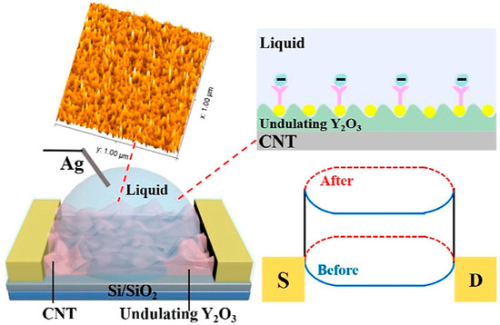 The early detection of lung cancer is of utmost importance, and carcinoembryonic antigen (CEA) serves as a well-established biomarker for this purpose. However, the full clinical potential of CEA has yet to be realized due to the demanding requirements for high sensitivity and broad detection capabilities. To address this challenge, Li et al. [57] developed an innovative biosensing approach using a floating gate FET combined with a semiconducting CNT film and an undulating yttrium oxide (Y2O3) dielectric layer as the biosensing interface (Figure 5). The introduction of the rippling biosensing interface in the proposed device significantly expanded the detection range, enabling detection from ultra-low concentrations of 1 fg/mL to 1 ng/mL. Furthermore, the sensitivity and detection limit were optimized, achieving an impressive 72 ag/mL, attributed to the increased binding sites for the detection probes on the sensing interface and enhanced electric double-layer capacitance. Importantly, the developed sensing platform demonstrated its robust functionality in the presence of complex fetal bovine serum, thus exhibiting great potential for the early screening of lung cancer.