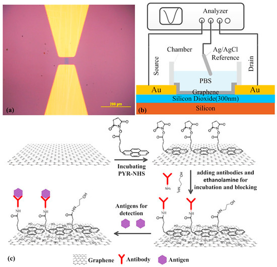 (a) Optical micrograph of the graphene channel; (b) schematic diagram of solution gated GFET biosensor; (c) the schematic diagram of all the modification steps for GFET. (Reproduced with permission from [62]).