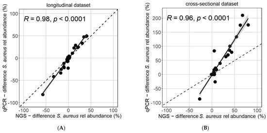 Moreover, the intra-individual differences in S. aureus relative abundance were strongly reproducible between the NGS and qPCR methods when comparing the difference between body sides in the longitudinal dataset (Figure 2A) or between lesional and non-lesional samples in the cross-sectional dataset (Figure 2B).