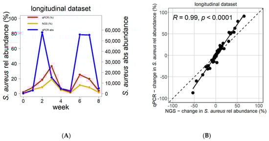 The changes in the longitudinal behavior of S. aureus follow the same pattern in relative abundance as measured by NGS, relative abundance as estimated by qPCR, or absolute abundance measured by qPCR (Figure 3A,B). However, the amplitude of fluctuations is higher when measured via qPCR than via NGS, as seen in the example in Figure 3A, which was validated for all patients (Figure 3B, Figure S2).
