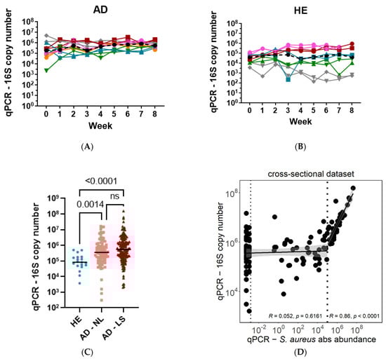 The aim of this study was to evaluate the consensus of S. aureus detection via qPCR and NGS. Furthermore, the relevance of bacterial load in the context of AD was assessed in a longitudinal and cross-sectional skin microbiome study comparing AD patients to healthy controls.