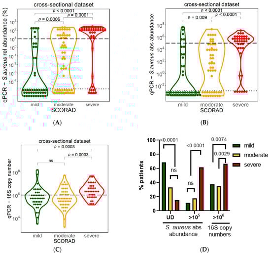 To investigate whether AD disease severity is driven by the proportion of S. aureus within the bacterial community or by absolute S. aureus cell numbers, we analyzed S. aureus abundance and the total bacterial load in the lesional samples from the cross-sectional dataset (n = 135) based on the following AD severity categories: mild, moderate, and severe, as defined by the SCORAD index. Higher S. aureus relative abundance, measured by NGS, as well as S. aureus absolute abundance measured by qPCR, showed a significant association with AD severity (Figure 5A,B). In addition, significantly more mild AD patients (68.9%) had undetectable S. aureus load by qPCR as compared to patients with moderate (33.3%) and severe (15.4%) AD (Figure 5D). The fraction of patients with undetectable S. aureus load was not significantly different between moderate and severe patients.