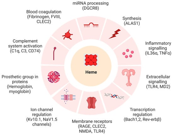 Biochemical systems and targets affected by heme with example proteins (in brackets), whose functions were shown to be impaired upon heme binding (created with BioRender (© 2023)). Abbrevations: ALAS1: δ-aminolevulinic acid synthase 1, Bach-1: BTB domain and CNC homolog 1, Bach-2: BTB domain and CNC homolog 2, CLEC2: C-type lectin-like type II transmembrane receptor, C1q: complement component 1q, C3: complement component 3, CD74: cluster of differentiation 74, DGCR8: DiGeorge critical region 8, FVIII: anti-hemophilic factor, IL-36α: interleukin-36α, Kv10.1, MD2: myeloid differentiation factor 2, NMDA: N-methyl-D-aspartate, Nav1.5: sodium channel protein type 5, RAGE: receptor for advanced glycation end products, Rev-erbB: nuclear receptor subfamily 1 group D, TLR4: Toll-like receptor 4, TNFα: tumor necrosis factor α.