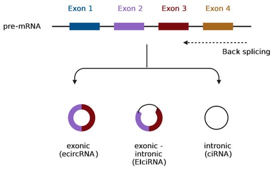 Circular RNAs (circRNAs) are single-stranded, continuous-loop RNA transcripts that are covalently closed. In general, precursor mRNAs (pre-mRNAs) are transcribed by RNA polymerase II (Pol II), and then they undergo a process called “canonical splicing” that is catalyzed by the spliceosomal machinery and involves the splicing of introns and ligation of exons for the formation of a linear RNA transcript (i.e., mature messenger RNA (mRNA)) with 5′–3′ polarity. However, these canonical spliceosome-mediated pre-mRNAs can also undergo a process called “back splicing” and form circular RNAs in this way. “Back-splicing” is a type of alternative splicing in which the 3′ end of an exon binds to the 5′ end of its own or an upstream exon via a 3′,5′-phosphodiester link, generating a closed structure with a back-splicing junction site [11,12,13]. Due to this structure, they are relatively stable and less susceptible to degradation by Ribonuclease R (RNase R) [14]. RNase R is an exoribonuclease that has the ability to degrade structured RNA molecules such as mRNAs or ribosomal RNA (rRNA) [15]. As circRNAs may arise from exons or introns, they are classified into three main subtypes of circRNAs: exonic (ecircRNAs), intronic (ciRNAs), and exonic-intronic (EIciRNAs) [16] (Figure 1). Furthermore, circRNAs exert their function through various mechanisms [13]. Among others, some studies demonstrate that they can act as miRNA sponges or competing endogenous RNAs (ceRNAs) and upregulate the miRNA target genes, contributing to gene regulation at the post-transcriptional level [17]. In addition, they have complex interactions with several proteins [13]. They can serve as protein sponges or decoys and affect their function [18]. They can also regulate parental gene expression through diverse mechanisms, such as translational modulation and post-translational modification [19]. Finally, their high abundance, stability, and evolutionary conservation between species are some of their intriguing characteristics [14,20], and growing evidence suggests their involvement in many diseases, such as cardiovascular disease, diabetes, cancer, etc. [11].