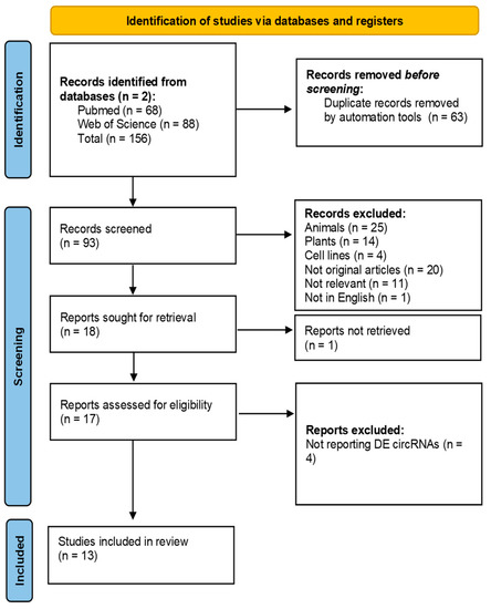 Based on the inclusion and exclusion criteria described in detail above, the 93 articles were manually screened by title, keywords, and abstract for eligibility. Of these, 43 were studies conducted in animals, plants, or cell lines; 20 were articles with non-original data (reviews, letters, etc.); 11 were not relevant to our subject of interest (male infertility or the study of circRNAs); and one was not in the English language, leaving a total of 18 articles for retrieval. More specifically, among the 11 articles excluded as irrelevant, four focused on the utilization of non-coding RNAs, or rRNA genes, as biomarkers in forensic body fluid identification [25,26,27,28]. Five articles examined the role of circRNAs in various types of cancer [29,30,31], as well as their involvement in other pathological conditions such as skeletal muscle atrophy [32] and bronchopulmonary dysplasia [33]. Another article presented a deep learning model that combines convolutional neural network and recurrent neural network architectures to accurately detect splicing sites specific to human circular RNAs using genome sequencing data [34]. Additionally, one article reported a co-analysis system for personal and body fluid identification [35]. We were unable to find the full text of one article; thus, 17 articles were evaluated during the eligibility stage. At the eligibility stage, we excluded four studies that did not report DE circRNAs. Finally, a total of 13 articles remained to be included in the present systematic review [36,37,38,39,40,41,42,43,44,45,46,47].