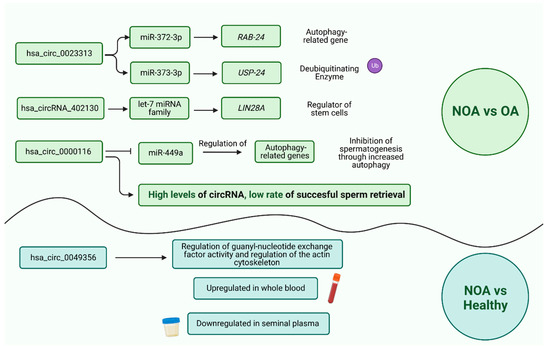 CircRNAs with a role in NOA pathogenesis. Image created with Biorender.com (accessed on 26 June 2023).