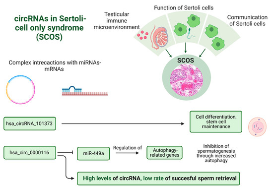 Finally, particular subtypes of azoospermia have also received attention, and specific circRNAs have been associated with them. For example, the main circRNAs associated with SCOS and the pathways deregulated by them are presented in Figure 7.
