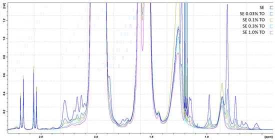 NMR analysis showed that with an increase in the size of the micelles in the emulsion (pure squalene emulsion and emulsions with 0.03–0.1% TO) in the NMR spectrum, the intensity decreased and the width of the corresponding signals increased. Conversely, an increase in the intensity and decrease in the signals in the NMR spectra was a consequence of a decrease in the size of the micelles in the emulsions with 0.3–1.0% TO.