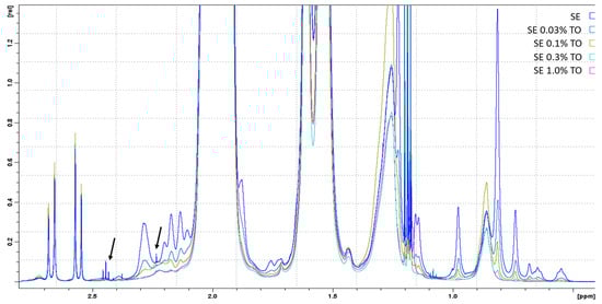 1D-1H-NMR spectra of freshly prepared emulsions with different turpentine oil contents, approximated in the terpenoid spectral region. The spectra of the emulsions are indicated with different colors and marked in the figure in analogy with Table 1. The arrows indicate minor impurities in 2-oxoglutarate (observed in the spectrum of pure squalene emulation, SE). Ethyl alcohol spectra were excluded from the analysis.