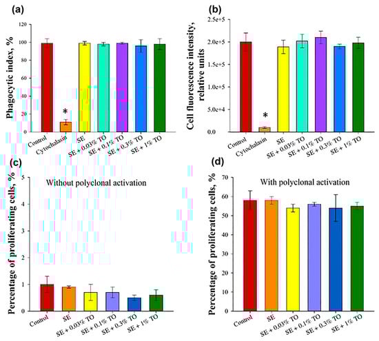 pHrodo Green E. coli, PE anti-mouse/human Ki-67 antibodies, PE Rat IgG2b k Isotype Ctrl, and IgE Mouse ELISA Kit were purchased from Thermo Scientific (Waltham, MA, USA). Span® 85 (S7135), TWEEN® 80 (S7135), Deuterium oxide (151882), Culture media DMEM and RPMI 1640, L-glutamine, Pokeweed Mitogen (PWM), phytohemagglutinin (PHA), cytochalasin D, Methyl Methanesulfonate, Saponin, ELISA kits Mouse IL-2 ELISA Kit, TWEEN® 20, Human Serum Albumin, and other chemicals were purchased from Sigma-Aldrich (St. Louis, MO, USA). Turpentine Oil (State Standard 1571-82, Top Grade RPC 24 1611 0120) was purchased from «IB Smirnova» (Moscow, Russia). Drabkin Method Kit was purchased from Agat-Med Ltd. (Moscow, Russia). EasySep™ Mouse Monocyte Isolation Kit was purchased from StemCell Technologies Inc. (Vancouver, BC, Canada). Mouse IFN-gamma Quantikine ELISA Kit was purchased from R&D Systems Inc. (Minneapolis, MN, USA). Mouse TNF alpha ELISA Kit, Mouse IgM ELISA Kit, and Abcam Histamine ELISA kit were purchased from Abcam (Cambridge, UK). Mouse IgG ELISA Kit was purchased from Cayman Chemical (Ann Arbor, MI, USA). All other reagents used were of analytical reagent quality.