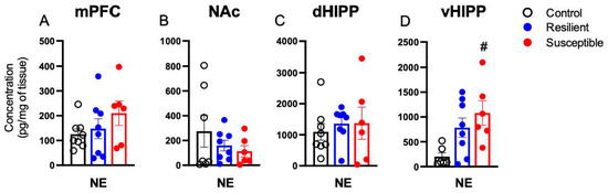 Effect of predator scent stress on brain levels of norepinephrine (NE) in the (A) medial prefrontal cortex (mPFC), (B) nucleus accumbens (NAc), (C) dorsal hippocampus (dHIPP), and (D) ventral hippocampus (vHIPP). vHIPP NE was increased in Susceptible females compared to Controls (D). Values expressed as mean ± SEM. # = p < 0.05 compared to Control.