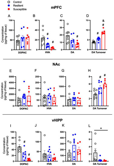 Effect of predator scent stress on brain levels of dopamine, dopamine metabolites, and dopamine turnover in the medial prefrontal cortex (mPFC), nucleus accumbens (NAc), and ventral hippocampus (vHIPP). (A) There was no effect of Phenotype on mPFC DOPAC. (B) mPFC HVA was decreased in Susceptible and Resilient rats compared to Control. (C) mPFC DA was decreased in Susceptible compared to Control. (D) DA turnover was increased in Susceptible and Resilient rats compared to Controls, and Susceptible show greater DA turnover compared to Resilient. No effect of Phenotype was observed in NAc DOPAC, HVA, or DA (E–G). (H) Susceptible and Resilient showed increased NAc DA turnover compared to Control. (I) vHIPP DOPAC was decreased in Susceptible and Resilient rats compared to Control. No effect of Phenotype was observed in vHIPP HVA (J) or DA (K). (L) Significant mean differences were detected in vHIPP DA turnover. Values expressed as mean ± SEM. * = p < 0.05 effect of Phenotype, # = p < 0.05 compared to Control, & = p < 0.05 compared to Resilient.