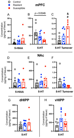 Effect of predator scent stress on brain levels of serotonin (5-HT), 5-hydroxyindoleacetic acid (5-HIAA), and 5-HT turnover in the medial prefrontal cortex (mPFC), nucleus accumbens (NAc), and dorsal (dHIPP) and ventral hippocampus (vHIPP). In the mPFC, (A) no effect on 5-HIAA was detected, (B) there was a non-significant trend (p = 0.056) in 5-HT, and (C) a significant increase in 5-HT turnover for stress-Susceptible rats compared to Resilient and Control. No effect of stress was observed in the NAc (D–F), dHipp (G), or vHIPP (H). Values expressed as mean ± SEM. # = p < 0.05 compared to Control, & = p < 0.05 compared to Resilient.
