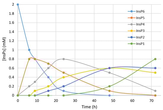 We first recorded the evolution of hydrolysates (dephosphorylation products) of InsP6 during thermal hydrolysis in a metallic dry bath block heater at pH 2.0 and 97 °C (Figure 1). The InsP6 level decreased by about 50% and the InsP5 level reached its maximum at about 6 h; InsP4 reached a maximum at about 24 h; and InsP3 and InsP2 reached their maxima at about 48 h. These results coincide with those obtained in previous studies by us [14] and other authors in the same conditions [22].