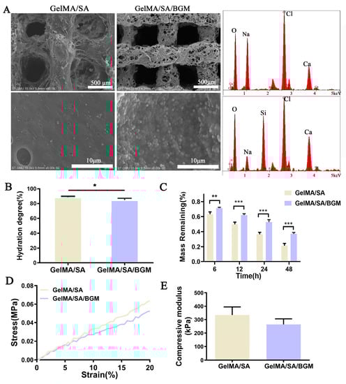 Characterization of GelMA/SA and GelMA/SA/BGM scaffolds. (A) SEM images and EDS analysis of GelMA/SA and GelMA/SA/BGM scaffolds. (B) Water absorption. (C) Degradation rate in the type II collagenase solution. (D) Stess-stain curving. (E) compressive modulus. * p < 0.05, ** p < 0.01, *** p < 0.001 vs. GelMA/SA.