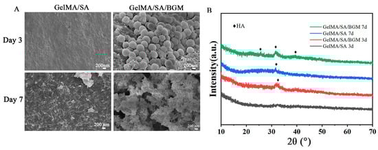 (A) SEM images and (B) XRD patterns of GelMA/SA and GelMA/SA/BGM after immersing in SBF for 3 and 7 days.