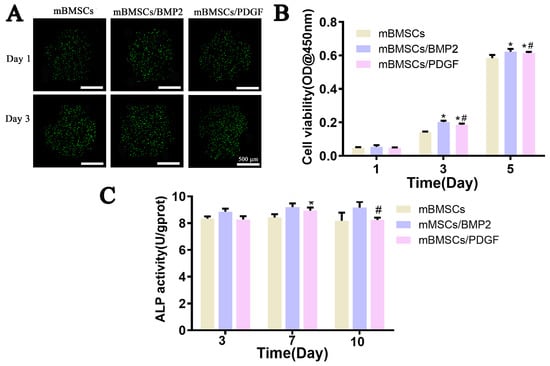 Cell viability, proliferation and ALP activity evaluation of mBMSCs encapsulated in GelMA/SA/BGM hydrogel after 3D bioprinting. (A) Live/dead cell staining. (B) Cell proliferation. (C) ALP activity. * p < 0.05 vs. control, # p < 0.05 vs. GelMA/SA.