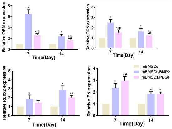 The expression of OPN, OCN, Runx2 and FN of mBMSCs in 3D-bioprinted scaffolds after culturing for 7 and 14 days. * p < 0.05 vs. mBMSCs scaffold, # p < 0.05 vs. mBMSCs/BMP scaffold.