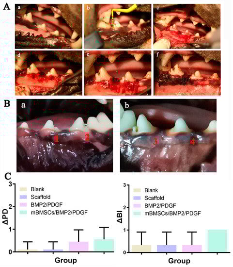 (A) Construction of acute periodontal defect in beagle dogs, (a) preoperative photograph, (b) periodontal examination, (c) flap, (d) construction of 5 mm × 5 mm bone defect, (e) scaffold implantation, (f) suture. (B) Intraoral photographs at 8 weeks after surgery. (a): (1) blank group, (2) scaffold group; (b): (3) BMP2/PDGF group, (4) mBMSCs/BMP2/PDGF group. (C) Periodontal status at 8 weeks after surgery.