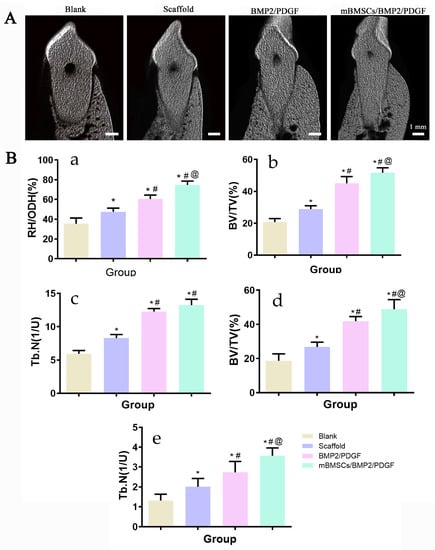 (A) Buccal-lingual micro-CT reconstruction 8 weeks after surgery. (B) Micro-CT analysis: (a) RH/ODH, (b) 2D analysis of BV/TV, (c) 2D analysis of Tb.N, (d) 3D analysis of BV/TV, (e) 3D analysis of Tb.N. * p < 0.05 vs. blank group, # p < 0.05 vs. scaffold group, @ p < 0.05 vs. BMP2/PDGF group.