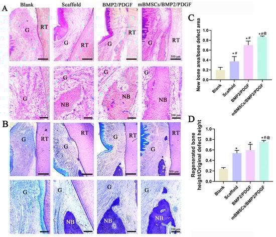 Histological evaluation and histomorphometric analysis of the periodontal tissue regeneration at 8 weeks after surgery. (A) H&E staining. (B) TB staining. (NB: new bone; RT: root; G: gingiva). (C) Ratio of new bone area to total bone defect area. (D) Ratio of new bone height to total bone defect height. * p < 0.05 vs. blank group, # p < 0.05 vs. scaffold group, @ p < 0.05 vs. BMP2/PDGF group.