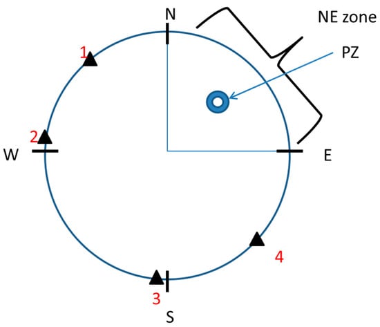 Schematic representation of the Morris water pool. PZ—platform; NE—the area inside which the platform was located; 1, 2, 3, 4—starting points.