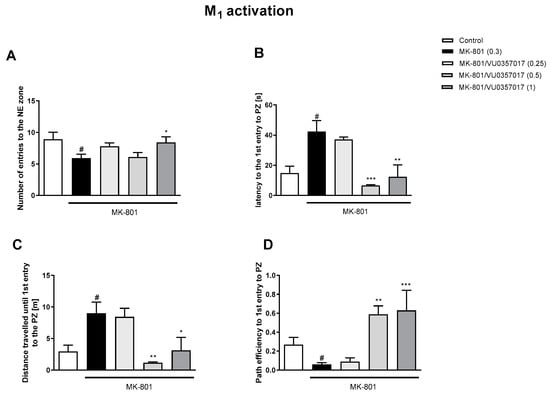 The effects of VU0357017 on MK-801-induced deficits in the retention of spatial memory in the MWM in CD1 mice. Sub-figures represent number of entries to the NE zone (A), Latency to the 1st entry to PZ (B), distance travelled until 1st entry to PZ (C) and pth efficiency to the 1st entry to PZ (D). The values are expressed as the means ± SEMs. # p < 0.001 vs. control group and * p < 0.05, ** p < 0.01, and *** p < 0.001 vs. the MK-801-treated animals (N = at least 8–10). PZ—platform zone.