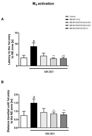 The effects of VU0152100 on MK-801-induced deficits in the retention of spatial memory in the MWM in CD1 mice. Sub-figures represent latency to the 1st entry to the NE zone (A) and distance traveled until the 1st entry to the NE zone (B). The values are expressed as the means ± SEMs. # p < 0.001 vs. control group and ** p < 0.01 vs. the MK-801-treated animals (N = at least 8–10).