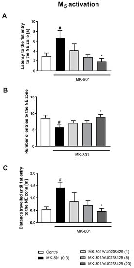 The administration of MK-801 impaired spatial memory in terms of several of the parameters measured (Supplementary Materials, Table S2). When administered alone, the compounds had no impact on animals’ behavior comparing to controls. The results are shown in the Supplementary Materials, Figure S3.