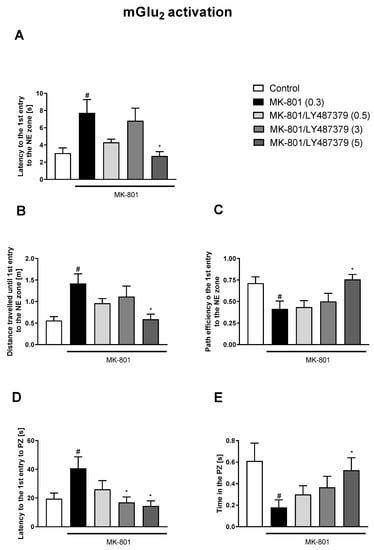 The effects of LY487379 on MK-801-induced deficits in the retention of spatial memory in the MWM in CD1 mice. Sub-figures represent latency to the 1st entry to the NE zone (A), distance travelled until 1st entry to the NE zone (B), path efficiency to the 1st entry to the NE zone (C), latency to the 1st entry to the PZ (D) and time spent in the PZ (E). The values are expressed as the means ± SEMs. # p < 0.001 vs. control group and * p < 0.05 vs. the MK-801-treated animals (N = at least 8–10). PZ—platform zone.
