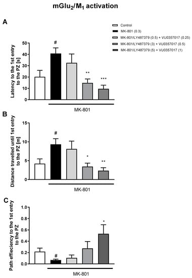 The effects of concomitant administration of LY487379 and VU0357017 on MK-801-induced deficits in the retention of spatial memory in the MWM in CD1 mice. Sub-figures represent latency to the 1st entry to the PZ (A), distance travelled until 1st entry to the PZ (B) and path efficiency to the 1st entry to the PZ (C). The values are expressed as the means ± SEMs. # p < 0.001 vs. control group and * p < 0.05, ** p < 0.01, and *** p < 0.001 vs. the MK-801-treated animals (N = at least 8–10). PZ—platform zone.