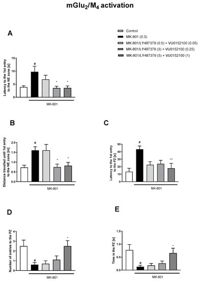 - Cieślik, P.; Radulska, A.; Pelikant-Małecka, I.; Płoska, A.; Kalinowski, L.; Wierońska, J.M. Reversal of MK-801-Induced Disruptions in Social Interactions and Working Memory with Simultaneous Administration of LY487379 and VU152100 in Mice. Int. J. Mol. Sci. 2019, 20, 2781. [Google Scholar] [CrossRef] [PubMed]